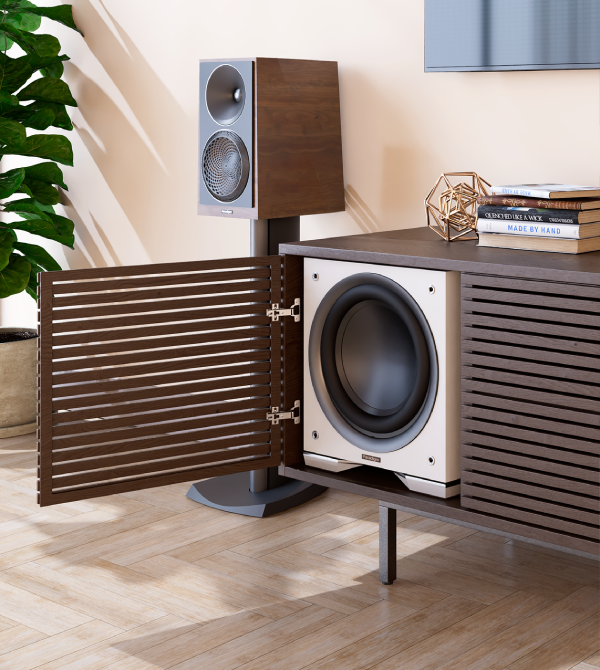 The Paradigm Defiance S-Series Subwoofer features an innovative "hide away" installation option, made possible by its sealed, portless design. This allows the subwoofer to be seamlessly integrated into custom-built shelving, freestanding cabinetry, or in-wall units, offering flexibility without compromising on sound performance.