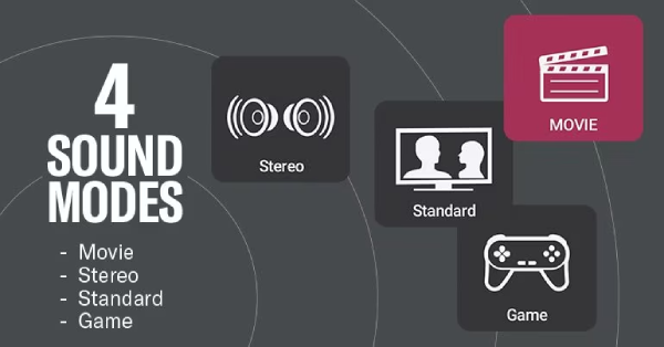 With four different sound modes, you can match the sound to your content and mood. Stereo mode works great for music and podcasts. Standard mode is ideal for TV programs. Try Game mode to immerse yourself in your latest battle, and use Movie mode to create an expansive theater experience.