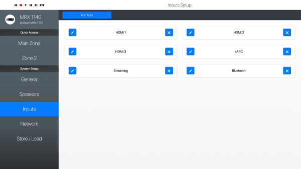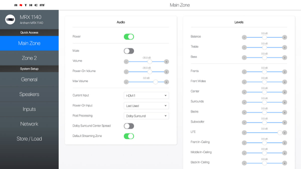 Anthem Web User Interface is now built in to all MRX Receivers and AVM Processors. Using a phone, tablet or laptop, owners can easily access any function or setting and make changes on the fly. Power the main or second zone on and off, adjust volume, change audio modes or tweak channel trims for a perfect surround sound experience. Web UI can also be used to calibrate speaker delays and levels and configure network settings/control options. Source devices can be renamed, simplifying set up by enabling the elimination of unused inputs. Installers can import and export files to make remote management simple and convenient.