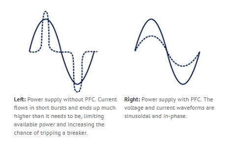 Power Factor Correction (PFC) maximizes available power and at the same time reduces (by a large amount!) the noise put on the AC line. Without PFC, the input current can flow and charge the capacitors only during the short moments that voltage is at or very close to its positive or negative peak. Since power is the product of both voltage and current it is produced only when both are present. Power Factor Correction marries the voltage and current cycles enabling continuous output from the power supply through the entire AC cycle. In doing so, the load appears almost purely resistive to the AC source. (See diagrams to right)