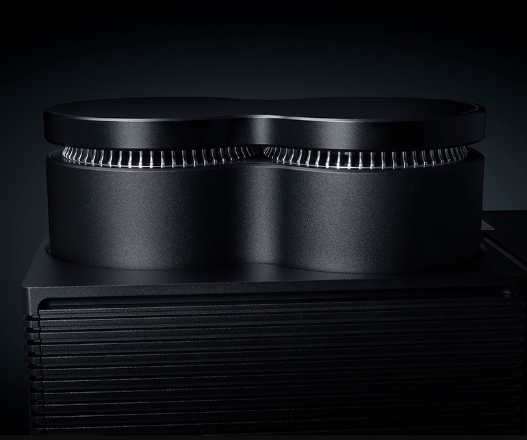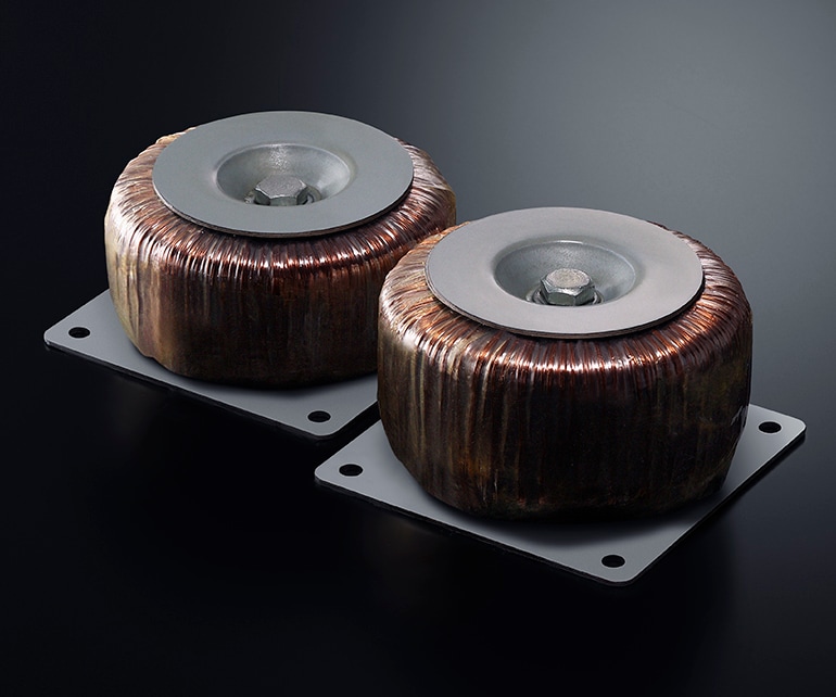 Following traditional audio principles and maintaining a low center of gravity, two transformers are mounted on the main frame and represented in the unique external design, invoking an impression of fine modern architecture. Furthermore, thanks to a vertical three-dimensional structure, the transformer is located immediately above the power supply board, minimizing the power supply path, contributing to a design that delivers both high sound quality and external elegance.