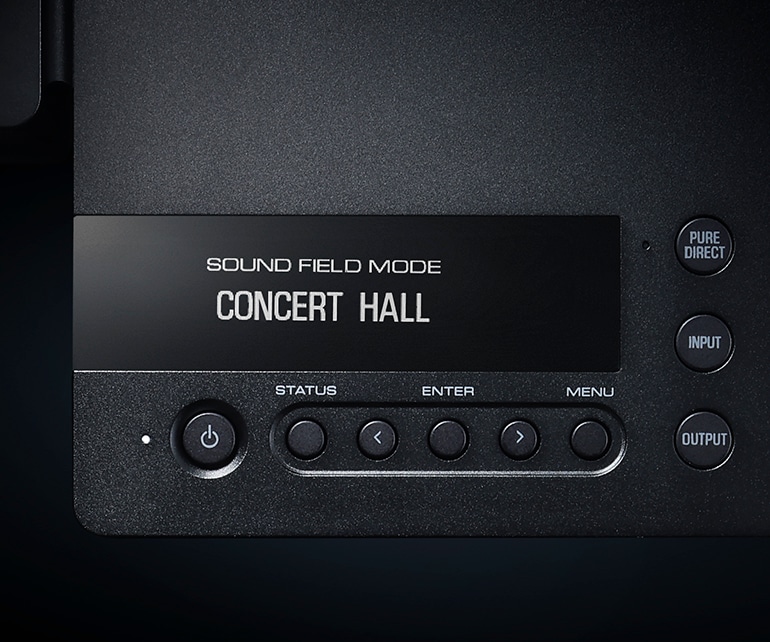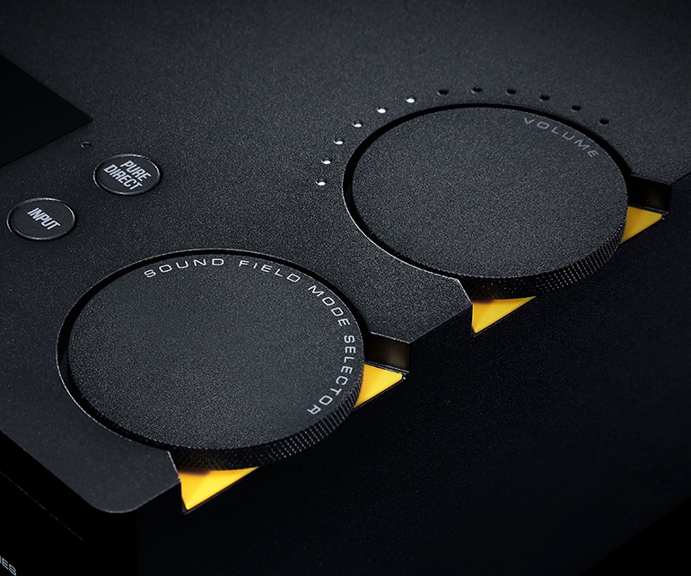 The top panel of the unit features a gorgeous OLED display that provides a variety of important information, including the input source, its sampling frequency, volume, and the name of the SOUND FIELD mode used—all in an exceptionally easy-to-read manner. The display automatically turns off after being operated, eliminating any distraction or slight undesirable effects on the sound.
