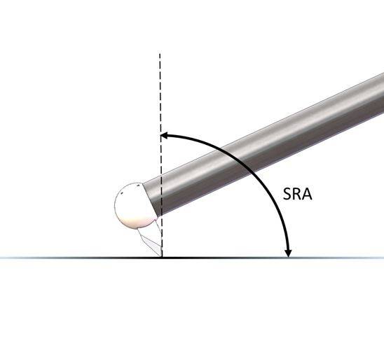 The Stylus Rake Angle (SRA - see figure) is very important to the performance of the Replicant 100 stylus, and the long contact surface (the sharp edge) of the diamond should be almost perpendicular to the record surface when viewed from the side. The angle between the record surface and the cantilever is close to 23 degrees when SRA is 90 degrees.