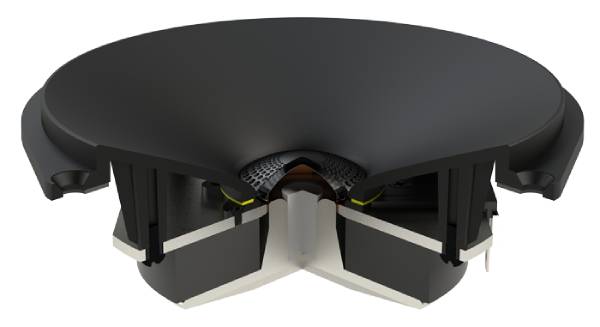 | HIGH-FREQUENCY DRIVER | Coaxial 1" (25mm) AL-MAC™ Ceramic Dome with Oblate Spheroid Waveguide (OSW™) and Perforated Phase-Aligning (PPA™) Tweeter Lens, ferro-fluid damped / cooled, Patent Pending Dual Gap Motor Structure |