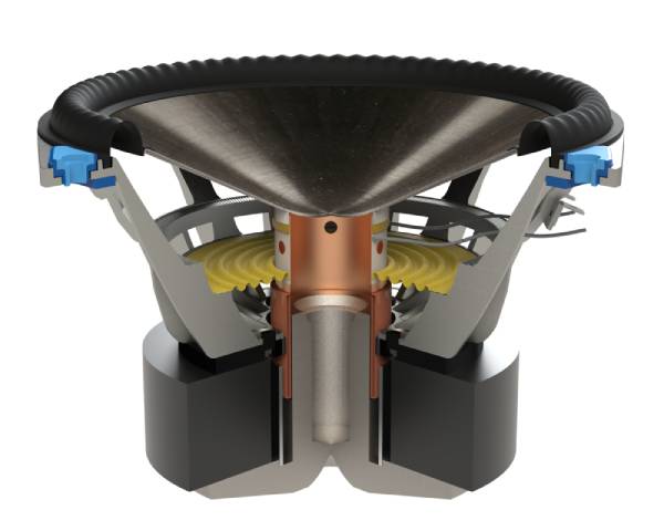 The Founder’s Bass driver is a 6” (152mm), 7” (177mm) or 8” (215mm) Ultra-High-Excursion Unibody CARBON-X™ Cone, over-molded Gen3 Active Ridge Technology (ART™) Surround with Vertical Mounting System, Advanced SHOCK-MOUNT™ Isolation and a 1.5” high-temp multi-layered voice coil with ventilated Apical™ former.