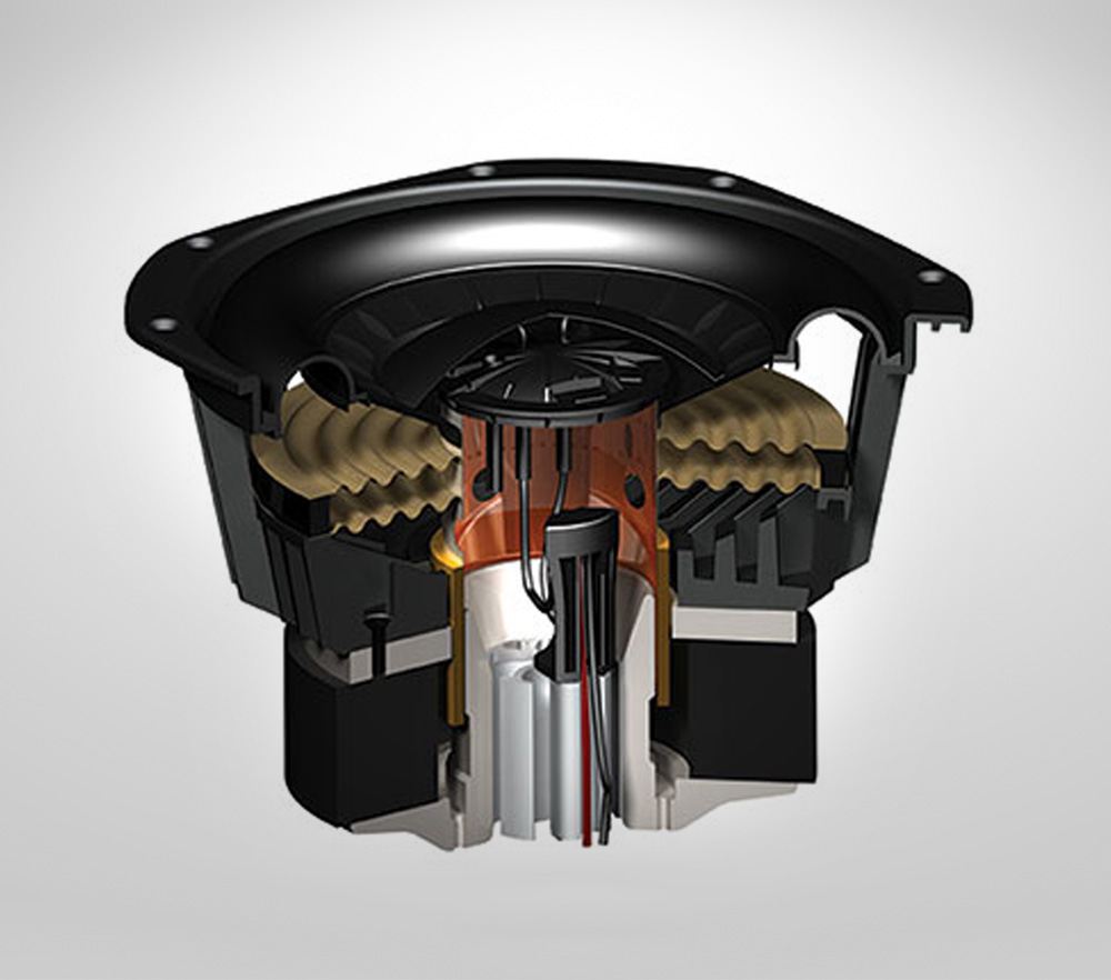 | LOW FREQUENCY DRIVER | Six 254-mm (10 in) RCR™ mineral-filled co-polymer polypropylene cones, FEA-optimized overmolded thermoplastic foam-surrounds, 76-mm (3 in) ten-layer long-excursion voice coils, high-temperature composite Nomex® formers, dual advanced spiders, 25.2-lb (10.5 kg) hard ferrite magnet / motor structure, massive center heatsink and oversize pole piece, AVS™ die-cast heatsink chassis |