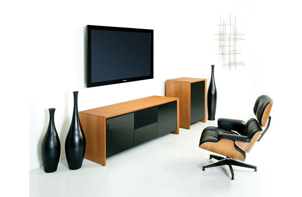 Clean, cutting-edge design with beveled edges and precision miter joints is highlighted by a natural cherry or walnut wood finish with black smoked glass or gloss white doors.