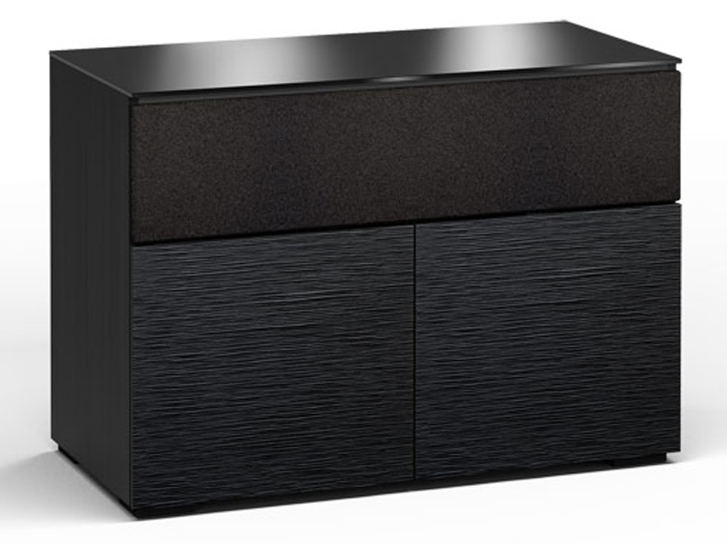 Lightly textured, black oak doors with black, tempered glass top and black oak finished side panels