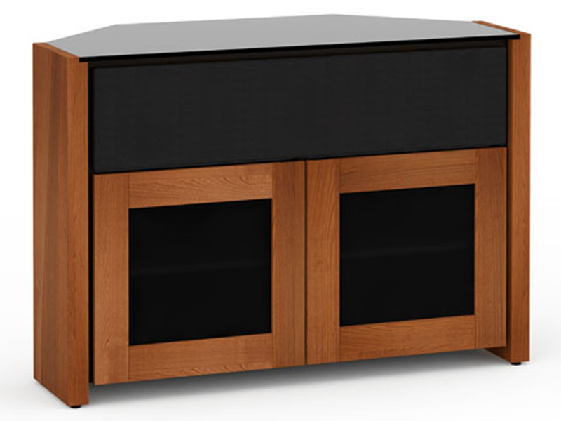 This easygoing and laidback style is represented in a cherry finish, with extra-thick end panels, and complemented by a seamlessly integrated black glass top.