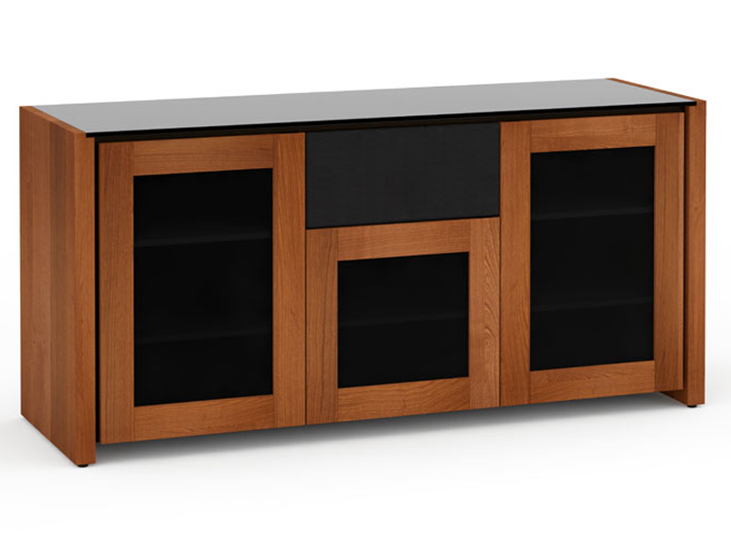 This easygoing and laidback style is represented in a cherry finish, with extra-thick end panels, and complemented by a seamlessly integrated black glass top.