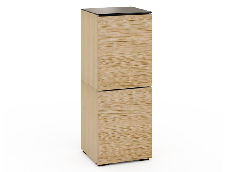 Deep textured, medium walnut or natural oak doors with brown, tempered glass top and matching smooth side panels