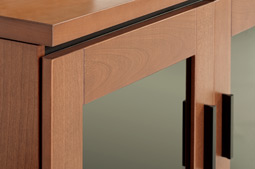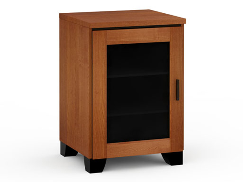 American cherry finish, wood framed smoked glass door with black aluminum pull