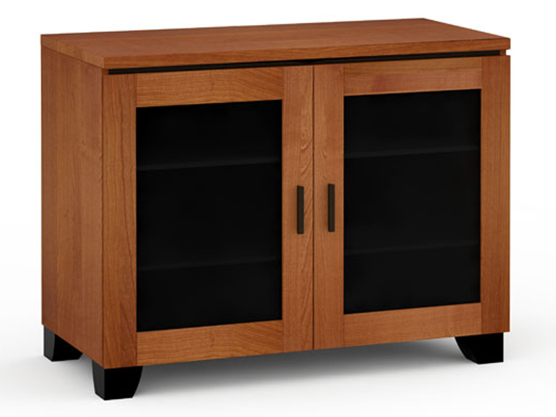 American cherry finish, wood framed smoked glass door with black aluminum pull