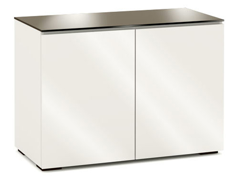 Sleek warm white, gloss doors and sides with brown, tempered glass top