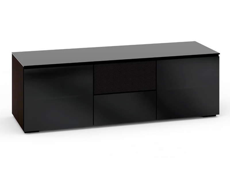 This black beauty's ultra-sleek techno aesthetic with aluminum framed doors and smoked glass is designed for true technophiles and urban sophisticates. This cabinet may mounted to the wall by simply removing the feet and attaching the wall mounting accessory.