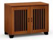 This elegantly crafted design is rendered in American cherry and features vertical slatted doors with black micro-perforated steel inserts for an updated Mission style.