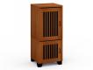 This elegantly crafted design is rendered in American cherry and features vertical slatted doors with black micro-perforated steel inserts for an updated Mission style.