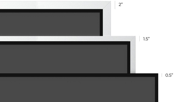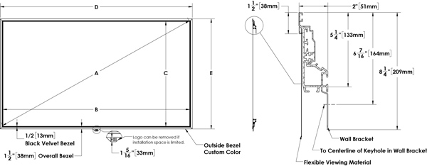 - Medium Frame: Aluminum extrusion with 1-1/2″ (38mm) “Zero Edge” style bezel with 1/2″ (13mm) velvet inlay.
