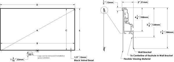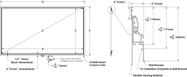 - Large Frame: Aluminum extrusion with 2″ (51mm) “Zero Edge” style bezel with 1/2″ (13mm) velvet inlay.